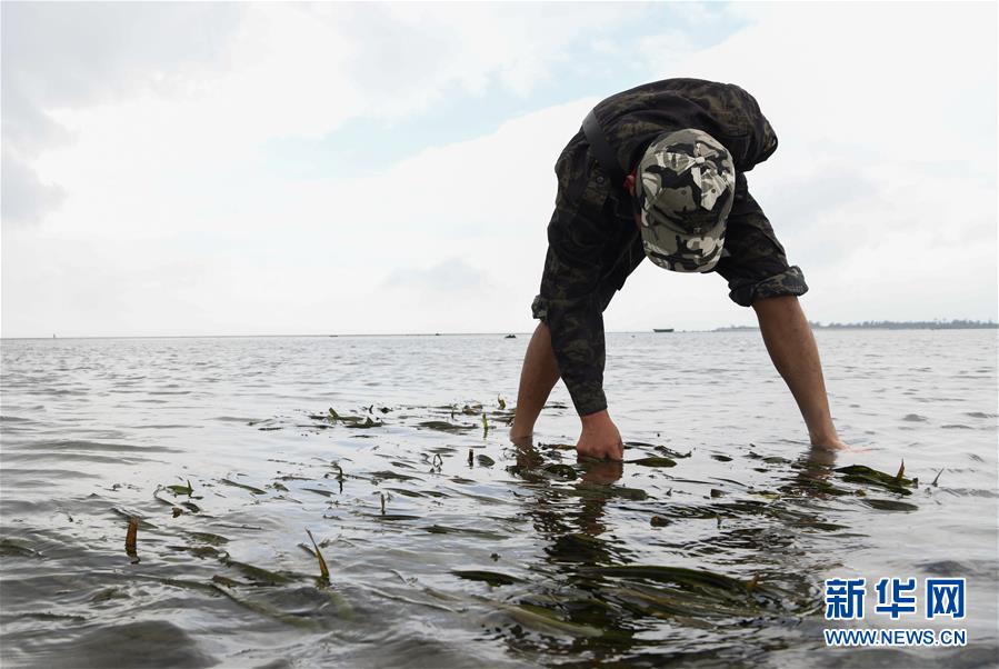 海南清澜港省级自然保护区护林员吕诗阳在保护区内的滩涂上查看海草情况(12月17日摄)。 新华社记者杨冠宇摄