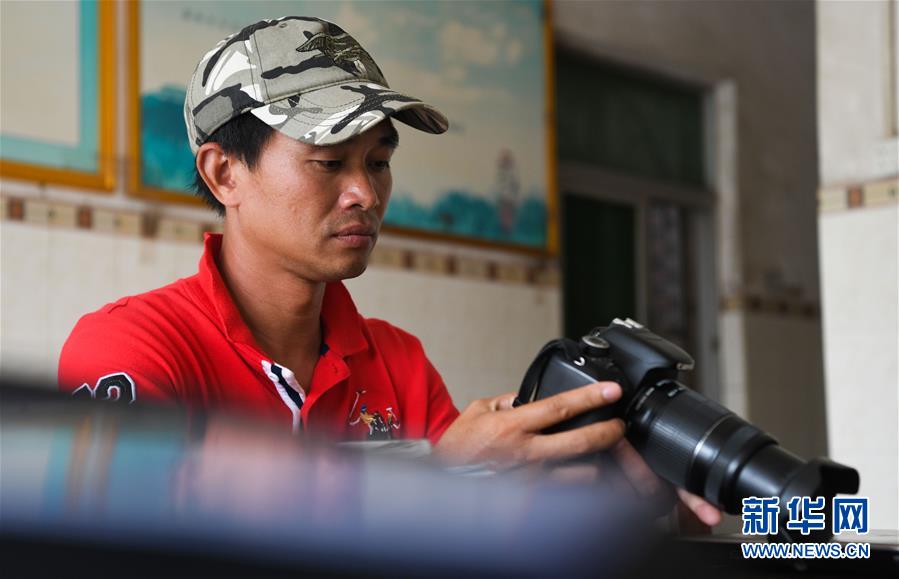 海南清澜港省级自然保护区护林员吕诗阳在保护区内的办公室里查看自己拍摄的照片(12月17日摄)。 新华社记者杨冠宇摄