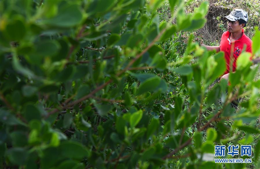 海南清澜港省级自然保护区护林员吕诗阳查看保护区内的红树林(12月17日摄)。 新华社记者杨冠宇摄