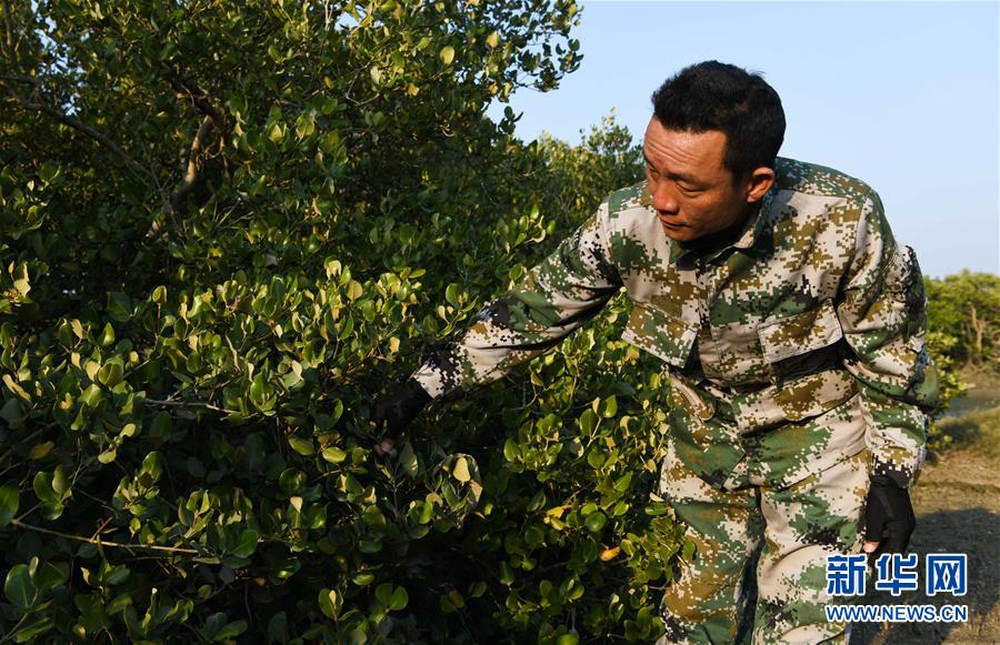 海南儋州新英湾红树林市级自然保护区护林员陈正平查看保护区内的红树林情况(12月9日摄)。陈正平2010年开始在保护区工作,他将工作发展成爱好,广泛参加各种培训和业内交流。他在工作中拍到濒危鸟类白肩雕出现在海南的照片,这刷新了海南省的鸟种记录。新华社记者杨冠宇摄