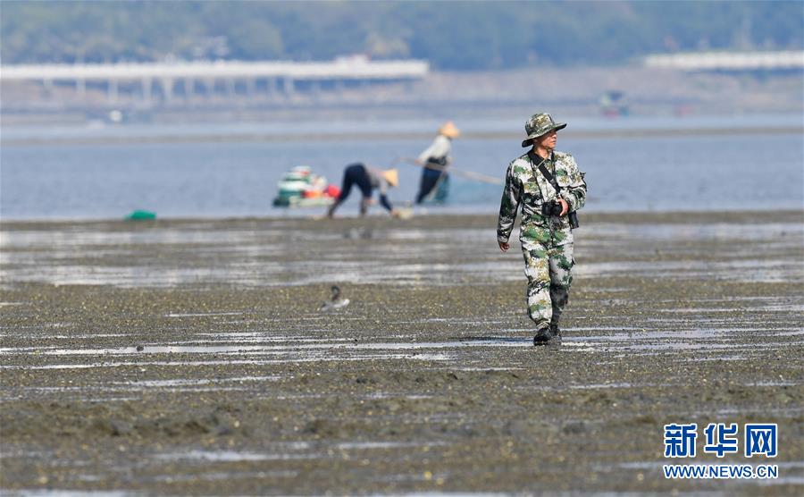 海南儋州新英湾红树林市级自然保护区护林员陈正平在保护区内的滩涂上巡护(12月10日摄)。 陈正平2010年开始在保护区工作,他将工作发展成爱好,广泛参加各种培训和业内交流。他在工作中拍到濒危鸟类白肩雕出现在海南的照片,这刷新了海南省的鸟种记录。新华社记者杨冠宇摄