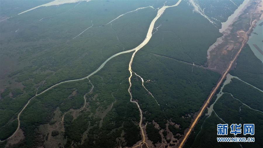 12月21日无人机拍摄的广西合浦县党江镇更螺围出海口一景。冬日,广西廉州湾海域风光别致。新华社记者张爱林摄