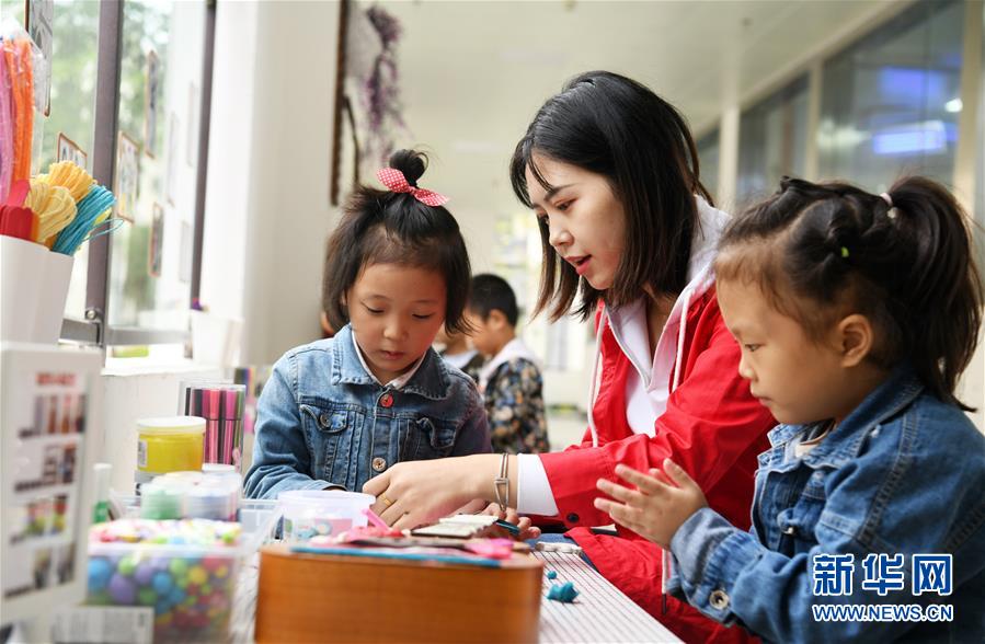 在贵州省正安县瑞濠街道易地扶贫搬迁安置点的一所幼儿园,老师指导小朋友做手工(10月11日摄)。新华社记者 杨文斌 摄
