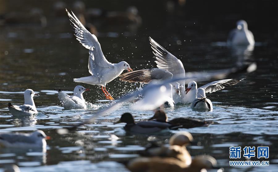11月21日,候鸟在拉萨龙王潭公园水中嬉戏。新华社记者普布扎西摄