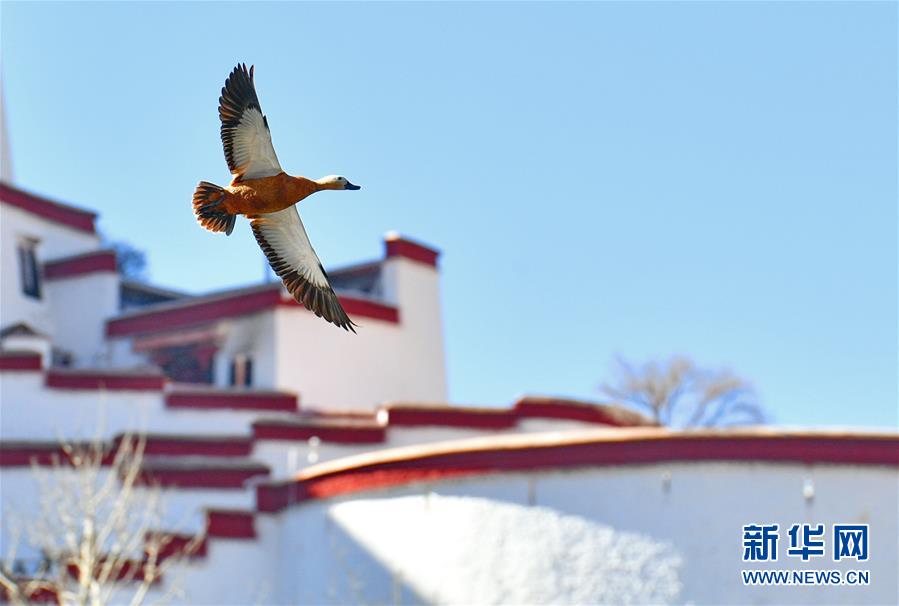 一只赤麻鸭从布达拉宫旁飞过(12月20日摄)。新华社记者张汝锋摄