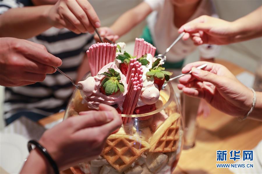 2019年7月28日,在泰国曼谷,顾客在一家冰淇淋店分享冰淇淋。这家冰淇淋店因为其超大款的冰淇淋走红网络,吸引许多游客前去拍照打卡。 新华社记者 张可任 摄
