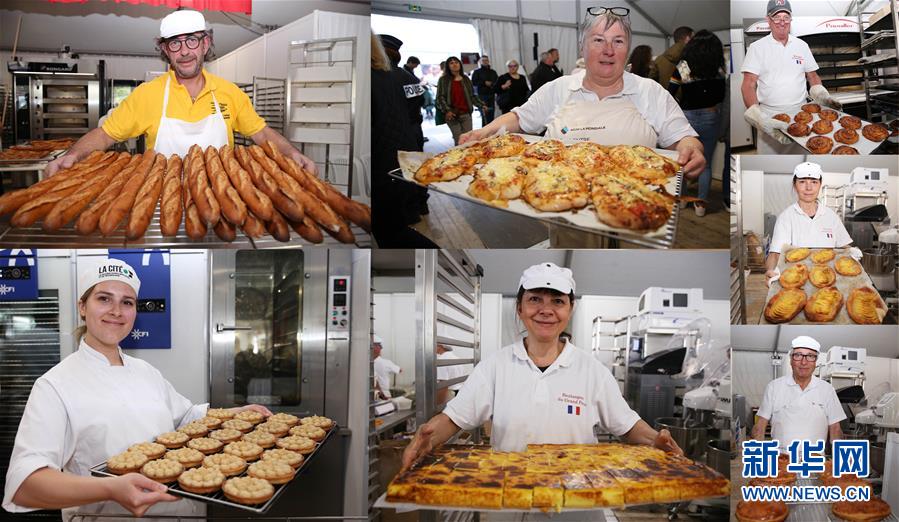 2019年5月11日,在法国巴黎圣母院附近举行的第24届面包节上,面包师展示新鲜出炉的面包和甜品(拼版照片)。 新华社记者 高静 摄