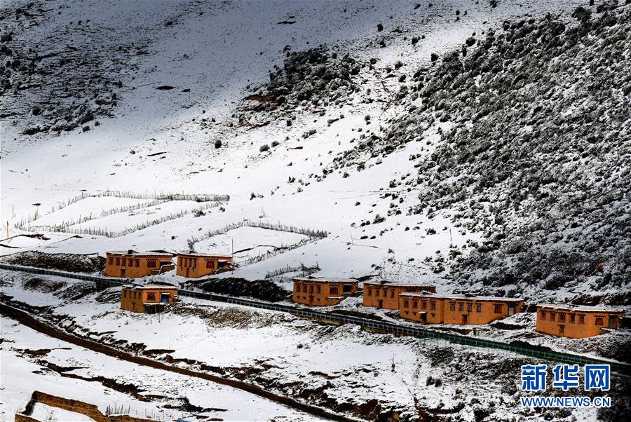 川藏线四川理塘县境内的雪山和民居(10月17日摄)。新华社记者陈天湖摄