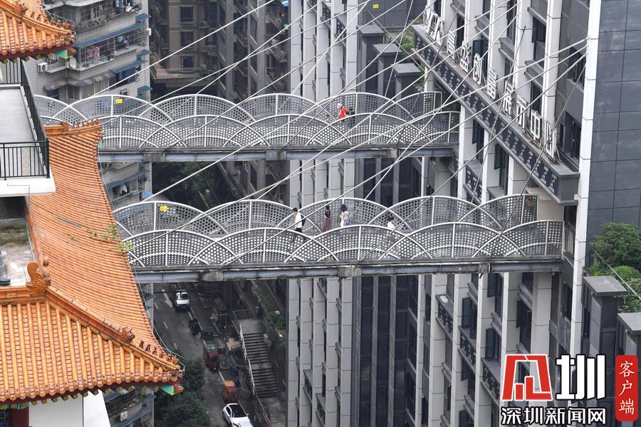 2019年6月12日,重庆临江门的高盛创富中心1楼位于嘉陵江滨江路,但如果坐电梯上到27楼,则可以通过空中廊桥到达的魁星楼城市休闲广场以及北区路。这两座空中廊桥的不远处,可以看到圣地大厦的空中廊桥。