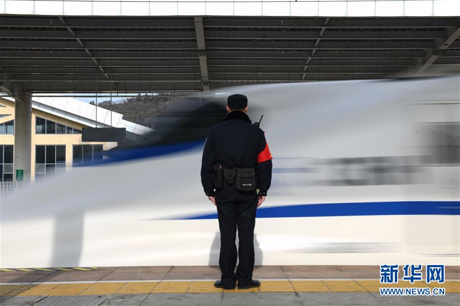 金寨火车站派出所民警张嗣一在站台接车(12月19日摄)。安徽合肥铁路公安处金寨火车站派出所位于大别山腹地。在这里,除了所领导外,青年民警平均年龄不到29岁。他们远离家乡,扎根大山深处的小站派出所,战斗在守护客运平安的第一线。新华社记者张端摄