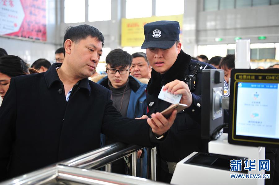 金寨火车站派出所民警吕锦鹏(前右)在检票口执勤(12月19日摄)。新华社记者邓坚摄