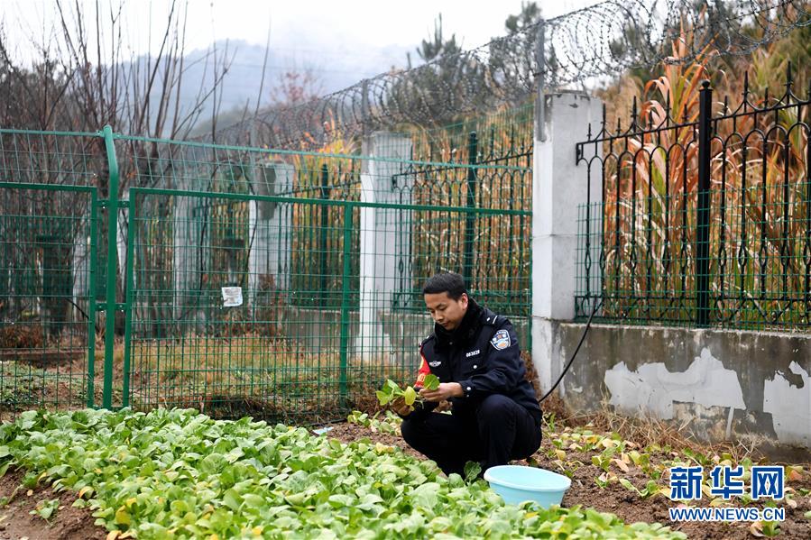 12月18日,常晓龙在菜园摘菜。警务室位于深山,平时买菜不方便,常晓龙在驻地院子里开垦了一片小菜园。新华社记者刘军喜摄