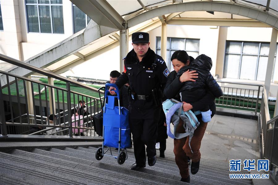 金寨火车站派出所民警何津超(前左)帮助旅客搬运行李(12月19日摄)。新华社记者邓坚摄