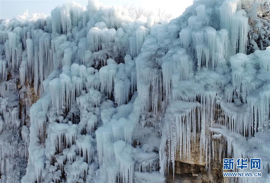 这是平山县沕沕水景区的冰瀑(12月25日无人机摄)。近日,河北省平山县境内的沕沕水景区出现冰瀑美景,形态各异的冰柱悬挂在山麓间,吸引游客前来观赏。新华社记者杨世尧摄