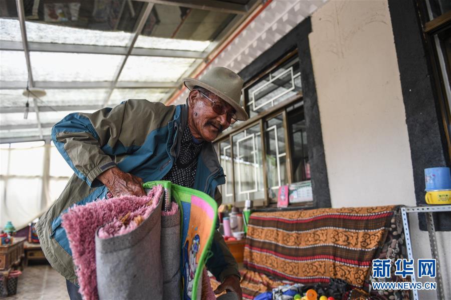 在西藏阿里地区札达县托林镇札布让村,76岁的达瓦次仁在整理家庭旅馆的床垫(7月30日摄)。新华社记者晋美多吉摄