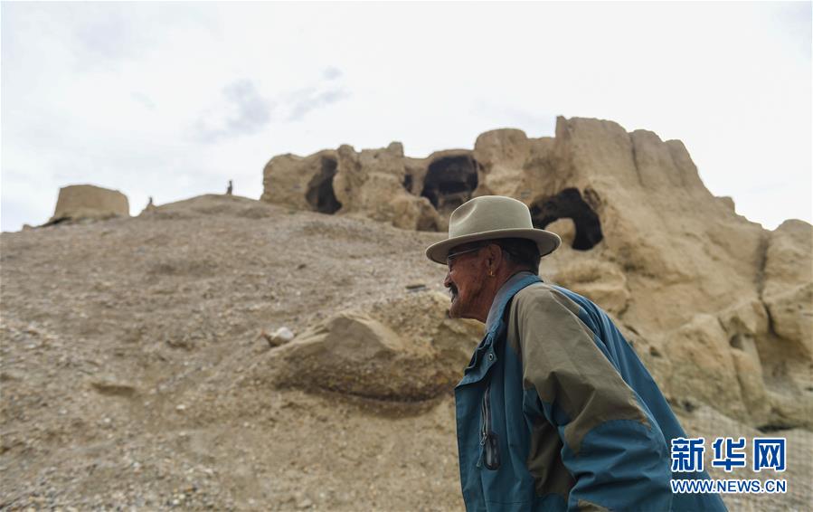 76岁的达瓦次仁走过古格遗址前的洞窟,这里曾是他的家(7月30日摄)。新华社记者晋美多吉摄