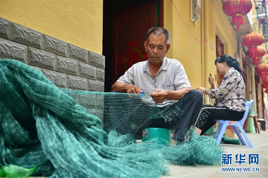 8月22日,福安市下岐村村民在织渔网。新华社记者林善传摄