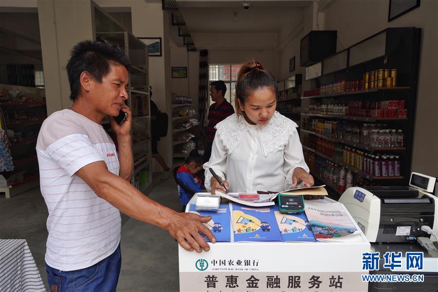 在大兴地镇维拉坝“珠海小区”金融服务站,姬红花(右)帮助村民提取现金(6月24日摄)。新华社记者秦晴摄