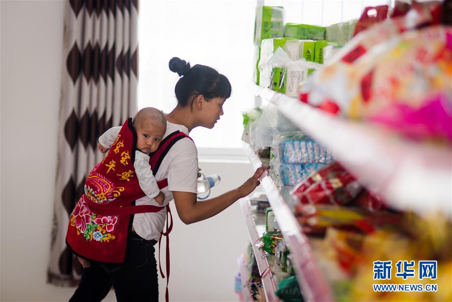 在大兴地镇维拉坝“珠海小区”的超市,村民三春梅在挑选商品(6月24日摄)。新华社记者胡超摄