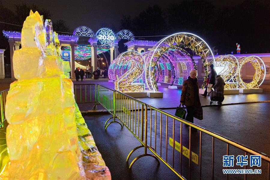 12月24日,在俄罗斯首都莫斯科,一名行人观看冰雕。 新华社记者 白雪骐 摄
