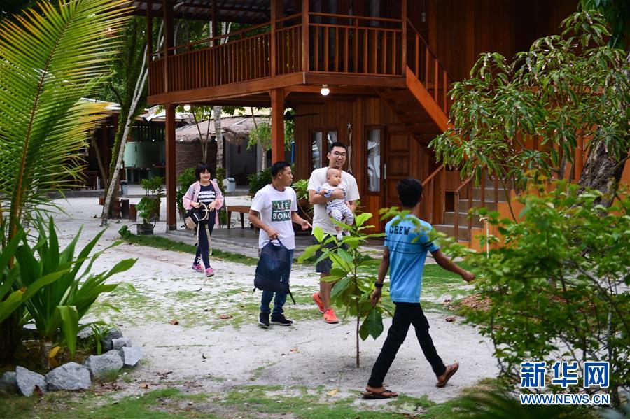 12月7日,在印度尼西亚邦加勿里洞省,李嘉文(左二)在李王岛上帮助游客入住。新华社记者杜宇摄