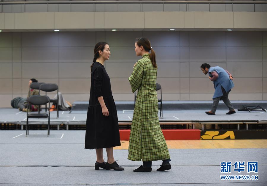 12月26日,在话剧《二月》中饰演陶岚的演员卢芳(前左)和饰演文嫂的演员黄薇(前右)在排练。