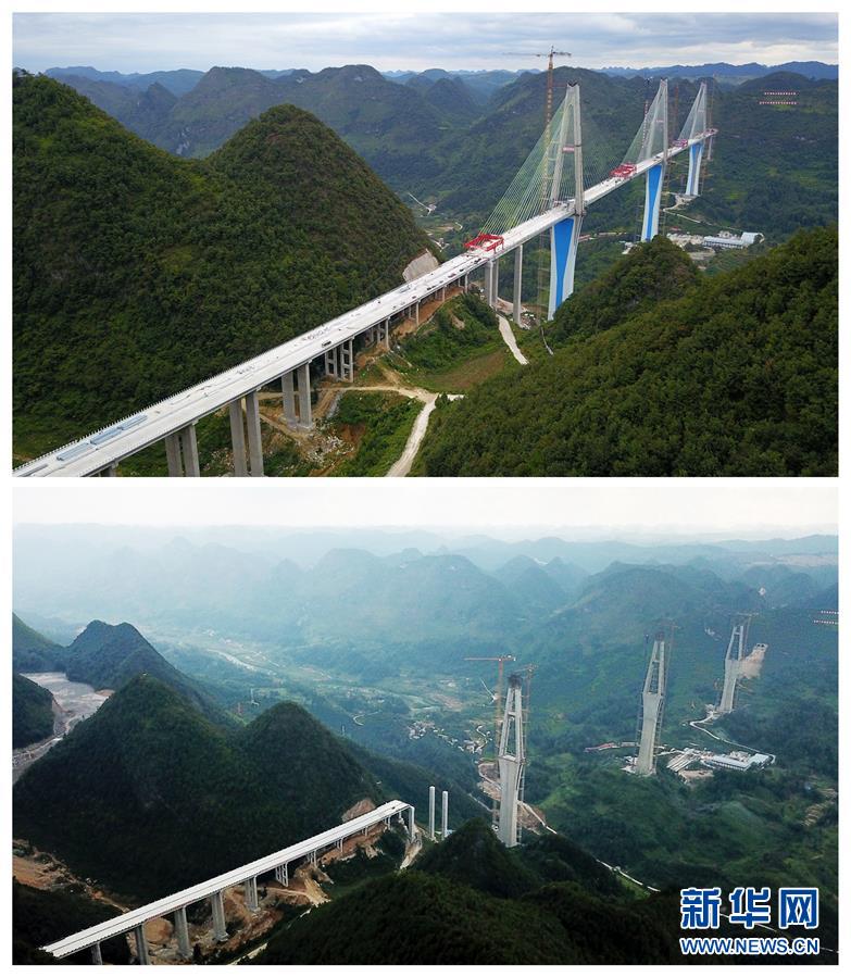 拼版照片:上图为2019年9月20日无人机拍摄的平塘特大桥;下图为2018年9月25日拍摄的平塘特大桥。新华社记者杨文斌摄