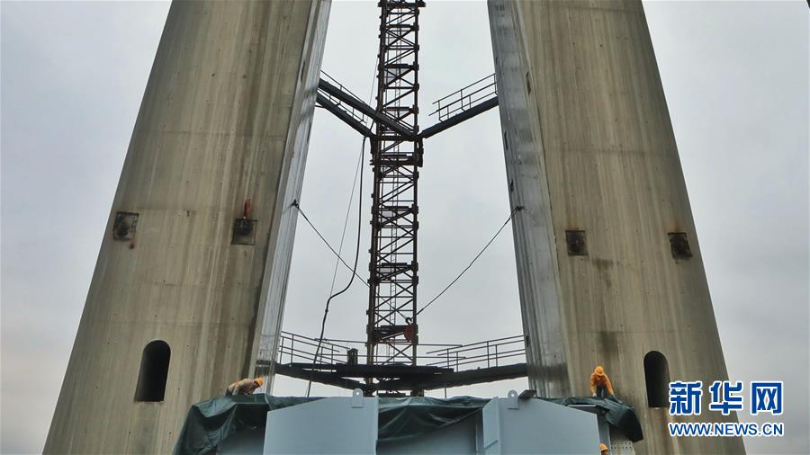 2019年1月7日,建设者在世界第一高混凝土桥塔上建设平塘特大桥。新华社记者欧东衢摄