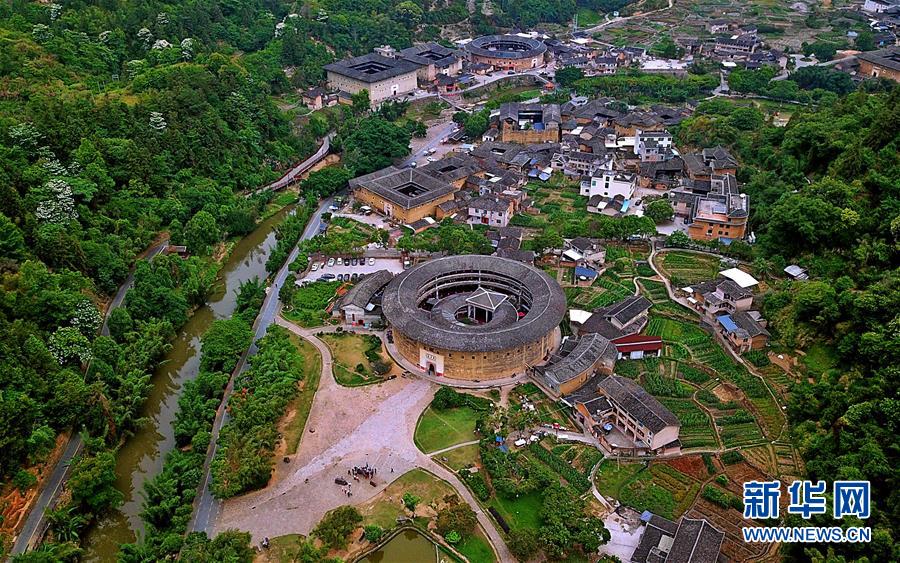 这是福建省龙岩市永定区湖坑镇洪坑村土楼群全景(5月4日无人机拍摄)。