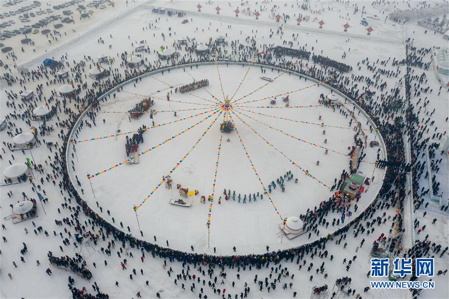 12月28日无人机拍摄的查干湖第十八届冰雪渔猎文化旅游节开幕式现场。