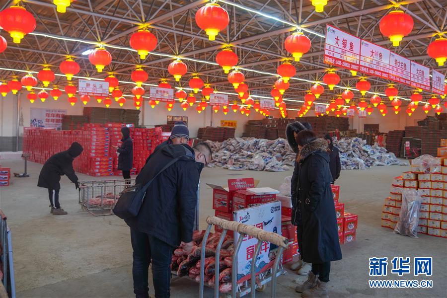 12月27日,在查干湖渔场超市,消费者选购查干湖鱼(无人机拍摄)。新华社记者张楠摄