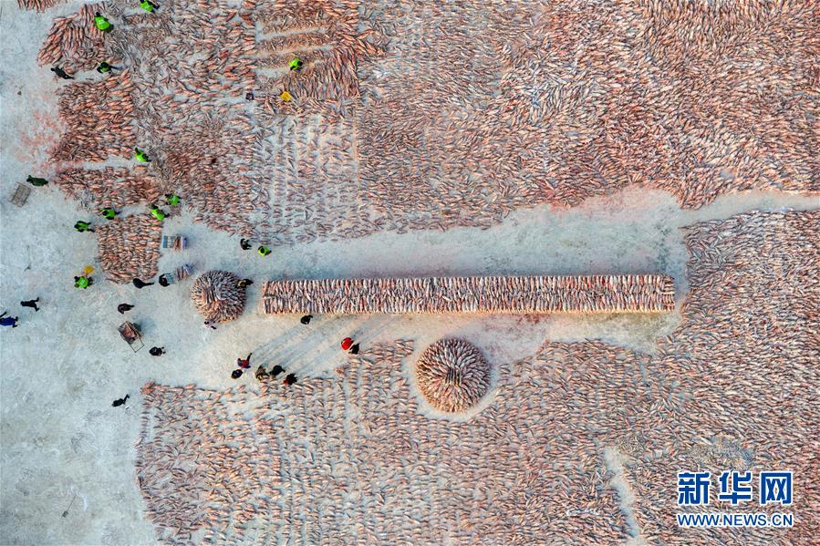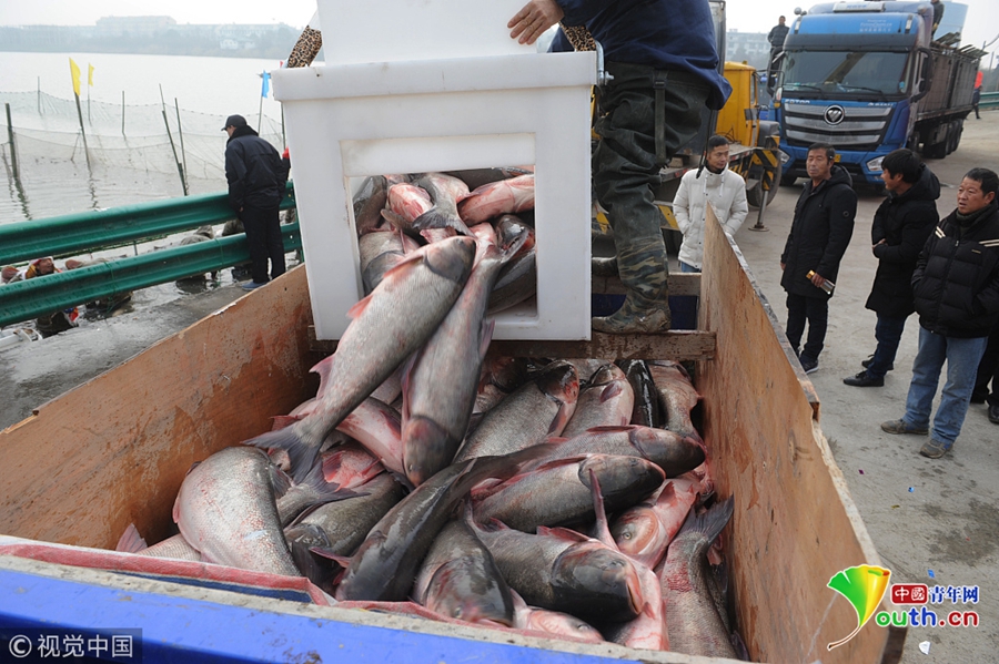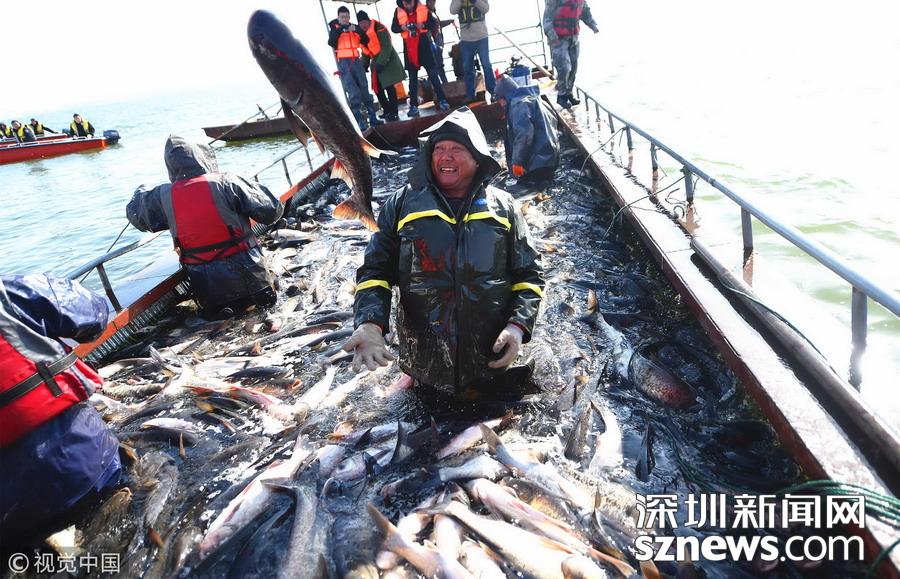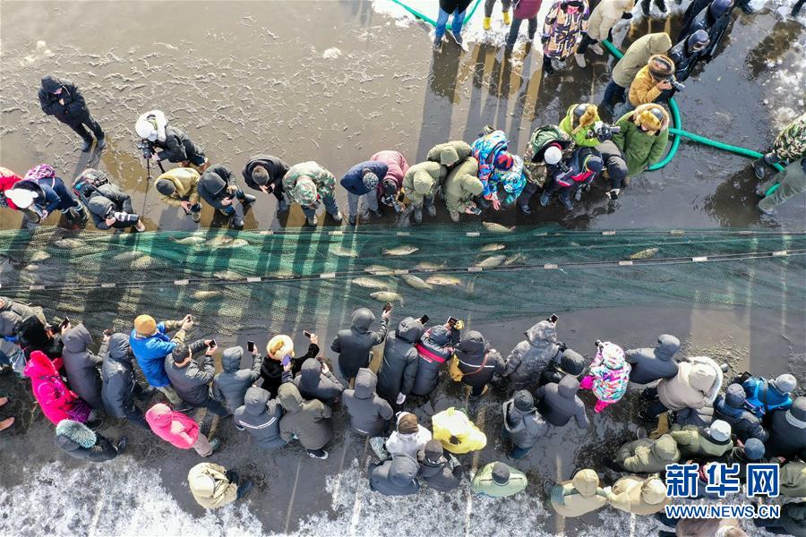 2018年12月26日,吉林松原,查干湖迎来了“红网”,单网捕捞约30万斤。