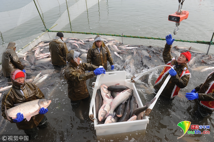 江苏扬州,渔夫将鱼捞出过秤。
