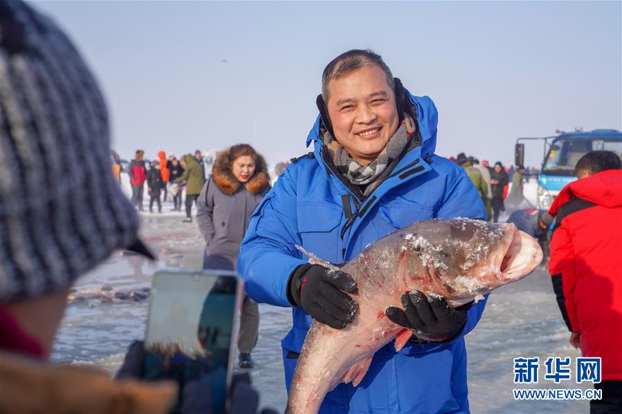 12月26日,在吉林松原查干湖冰面上,游客手捧刚打捞上来的鱼拍照留念。随着吉林松原查干湖冬捕知名度不断提高,全国各地消费者对查干湖鱼的需求量逐年增大。2014年开始,多个电商平台和快递企业纷纷抓住商机进驻查干湖。经过多年发展,借助互联网销售优势和日趋完善的快递网络,全国多地的百姓可以在鱼出水后的48小时内品尝到查干湖鱼的鲜美滋味。新华社记者张楠摄