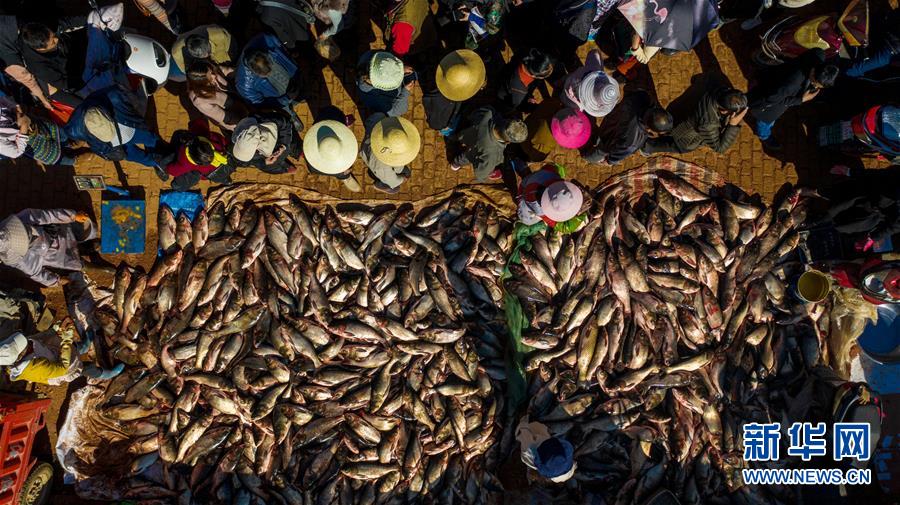 12月25日,人们在星云湖畔的老河咀鱼市选购刚捕捞的鲜鱼(无人机拍摄)。新华社记者胡超摄