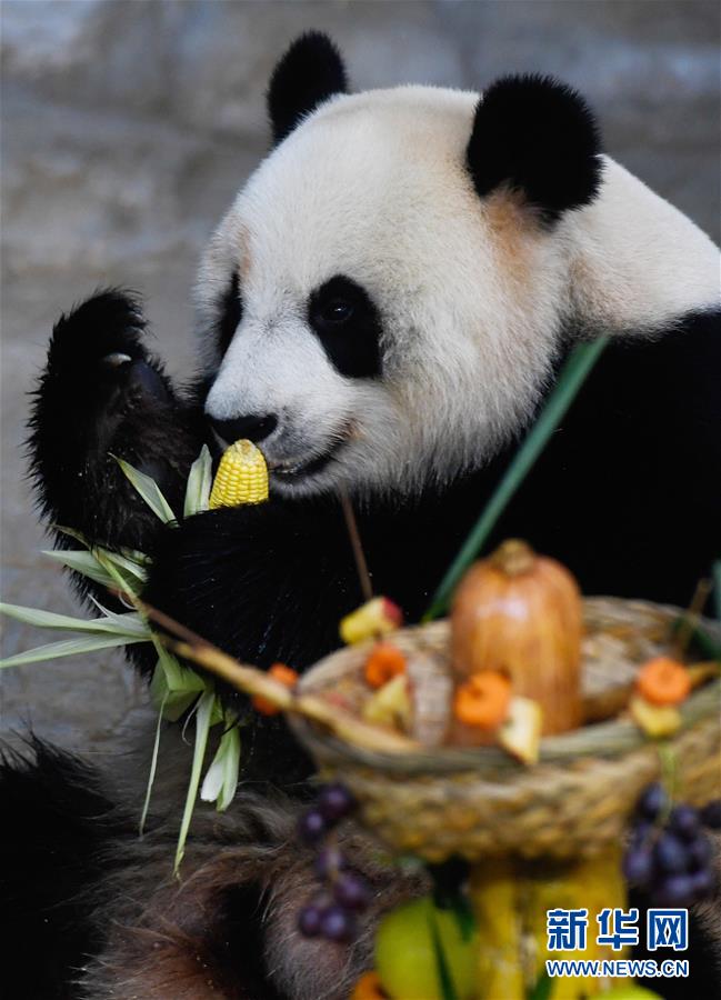 12月31日,大熊猫“贡贡”在吃玉米。 新华社记者 杨冠宇 摄