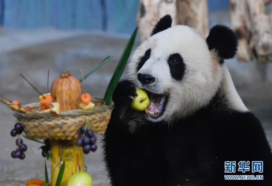 12月31日,大熊猫“贡贡”在吃梨。 新华社记者 杨冠宇 摄