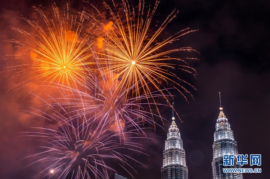 2020年1月1日,焰火在马来西亚吉隆坡的马来西亚国家石油公司双塔旁绽放,迎接新年的到来。新华社记者朱炜摄