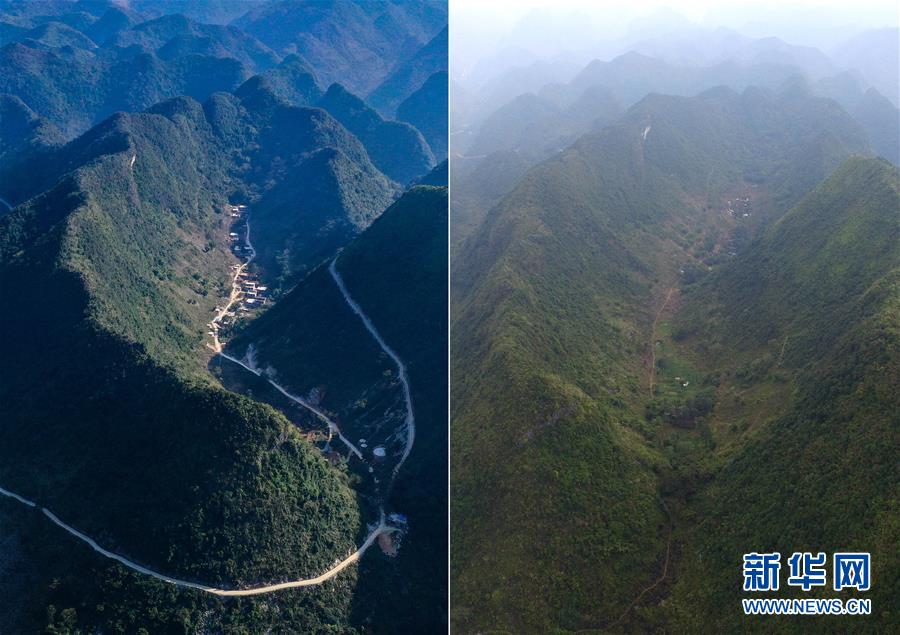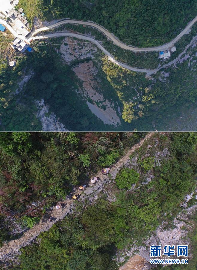 拼版照片:上图为刚刚修通公路的大化瑶族自治县板升乡八好村弄麻屯(11月11日无人机拍摄);下图为在尚未通路的八好村弄麻屯,孩子们爬山路回家(2016年9月23日摄)。新华社记者黄孝邦摄