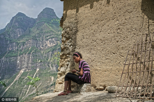 上学的孩子都背着沉沉的书包,大多数是女孩,15个孩子在三个家长的保护下,大约用了2个小时,到达“悬崖村”。上山容易下山难,遇到雨雪天气,村里人就不再外出了。图片来源:视觉中国