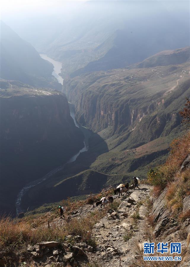 阿布洛哈村村民牵着马驮运物资到村子里(2018年11月17日摄)。新华社记者江宏景摄