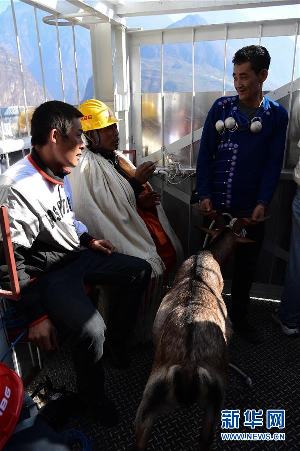 12月31日,阿布洛哈村村民吉尔牛日(右)拉着一头羊乘坐摆渡车出村。新华社记者江宏景摄
