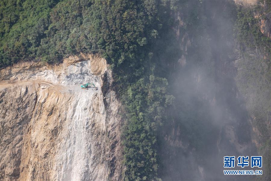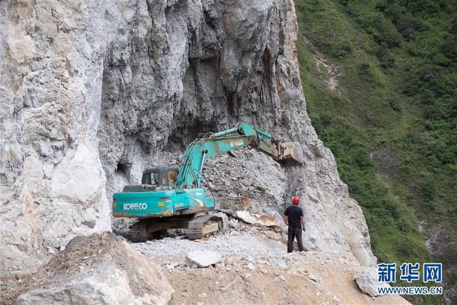 一辆挖掘机在阿布洛哈村悬崖修建通村公路(2019年7月18日摄)。新华社记者江宏景摄
