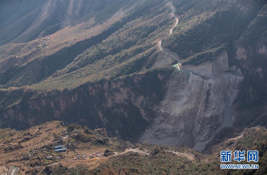 俯瞰阿布洛哈村通村公路(2019年12月27日摄)。目前公路已有近3公里铺设完成,剩下的路段多数要在碎屑岩、变质岩的悬崖绝壁上修建。新华社记者江宏景摄