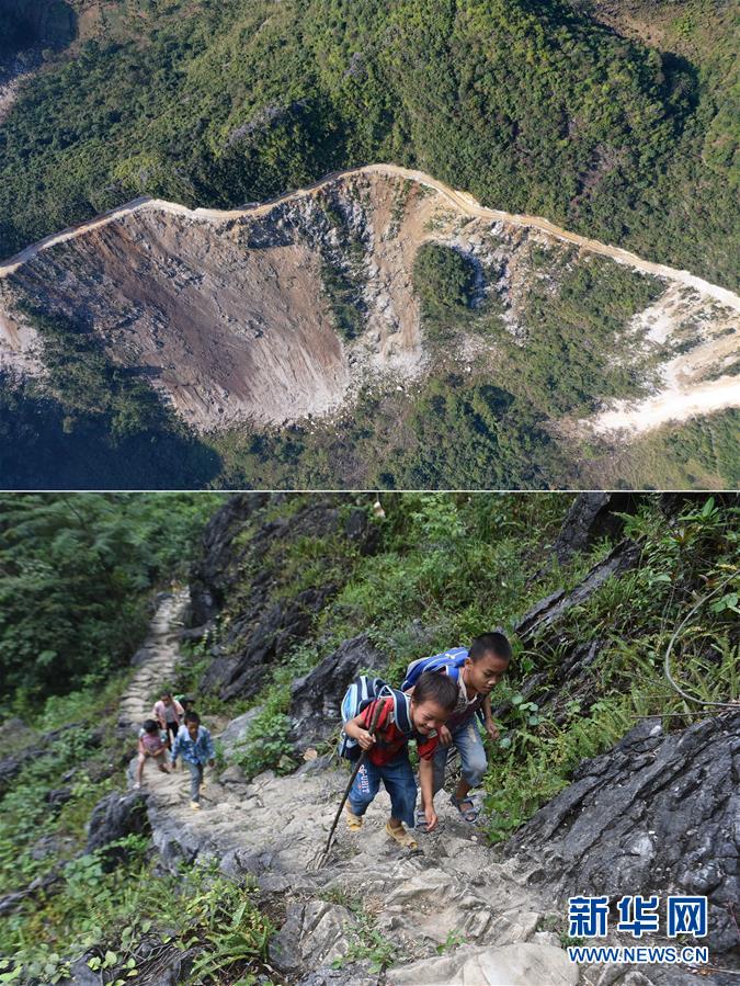 拼版照片:上图为刚刚修通公路的大化瑶族自治县板升乡八好村弄麻屯(11月11日无人机拍摄);下图为在尚未通路的八好村弄麻屯,孩子们爬山路回家(2016年9月23日摄)。新华社记者黄孝邦摄