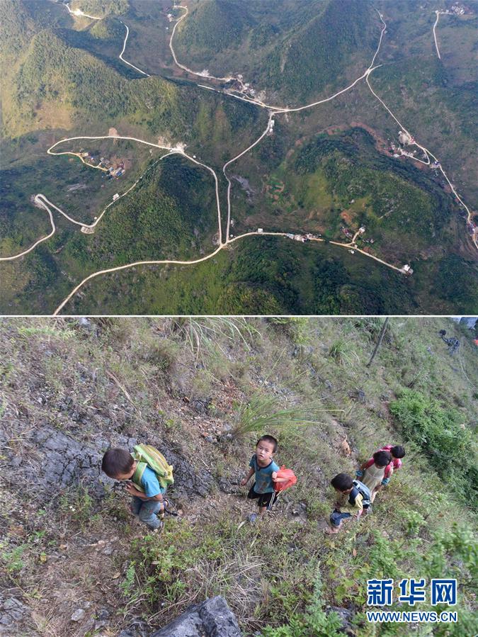 拼版照片:上图为大化瑶族自治县七百弄乡弄雄村各自然屯之间的公路网(11月10日无人机拍摄);下图为在弄雄村弄林屯,孩子们走在回家的山路上(2016年10月26日摄)。新华社记者黄孝邦摄