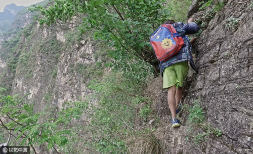 爬山开始前,陈木黑被陈古吉系上背包绳。前面由一个家长引路,中间一个家长,陈古吉带着陈木黑走最后,6岁的陈木黑已经在这条路上,上上下下几十次了。图片来源:视觉中国