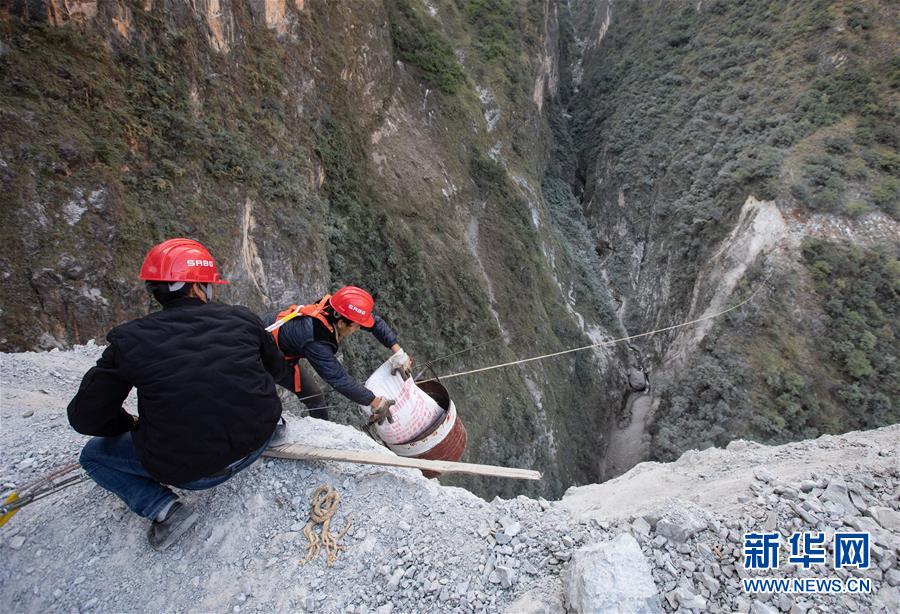 四川路桥的施工人员通过临时搭建的溜索运输施工物资到峡谷对岸(2019年11月20日摄)。阿布洛哈村通村公路施工遇到陡崖夹沟地势,项目进程艰难缓慢,四川路桥施工队伍开始在峡谷两端分头推进。新华社记者江宏景摄