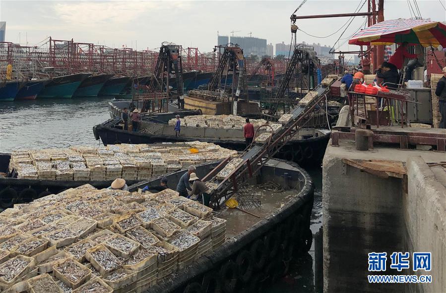1月1日,满载归来的渔船陆续驶进港湾,工人们在卸载渔获。新华社记者潘强摄