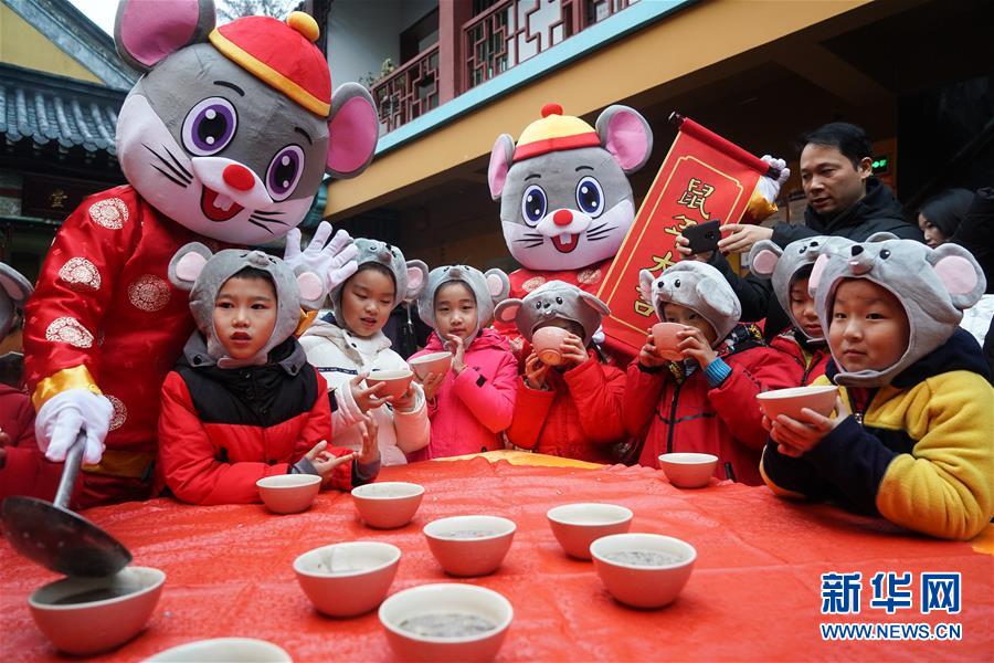 1月2日,小朋友在南京玄奘寺的赠粥送祝福活动现场喝腊八粥。 当日是农历腊月初八,中国传统腊八节。 新华社记者 季春鹏 摄